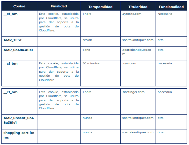 El acceso al sitio Web www.sparrakantiques.com puede implicar la utilización de cookies (pequeños archivos de información que se almacenan en el navegador de quien accede a la página web) para el correcto funcionamiento y visualización de los contenidos de la Web, así como para la personalización de cierta información, que únicamente la persona que visite nuestra web, visualizará. Por ende, las cookies son procedimientos automáticos de recogida de información referidas a determinadas preferencias de la persona, durante su visita a nuestro sitio web, con la nalidad de reconocerla como usuaria, personalizar su experiencia y el uso de la misma, así como también nos permiten ayudar a identicar y resolver posibles errores. La información que las cookies pueden recoger será: desde la fecha y hora en la que se produjo la visita a la web, páginas visionadas por la persona usuaria, el tiempo dedicado en la visualización de nuestros contenidos, así como los sitios web visitados con anterioridad y posterioridad. Sin embargo, ninguna cookie permitirá extraer información de tu disco duro, así como robar información personal y/o condencial. La única forma que la información privada es recabada por la cookie, será a través del consentimiento expreso en cuanto al uso en el tratamiento de sus datos personales por la cookie seleccionada. Dicho consentimiento será comunicado, en base a una elección claramente armativa, previamente a la realización del tratamiento de datos personales, pudiendo ser en todo momento revocado.